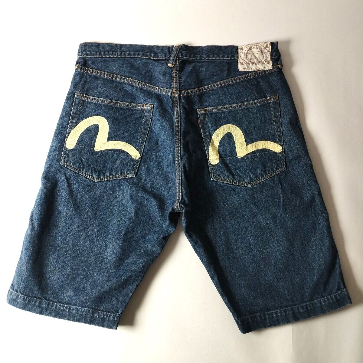 【備考】エヴィス7001デニムハーフパンツです。ディテールは2色ステッチ、白カモメペイント、ユニバーサル社製ジッパー、両面赤タブ、オフセットベルトループ、布パッチなど。多少使用感はございますが大きく目立つダメージは見受けられません。
