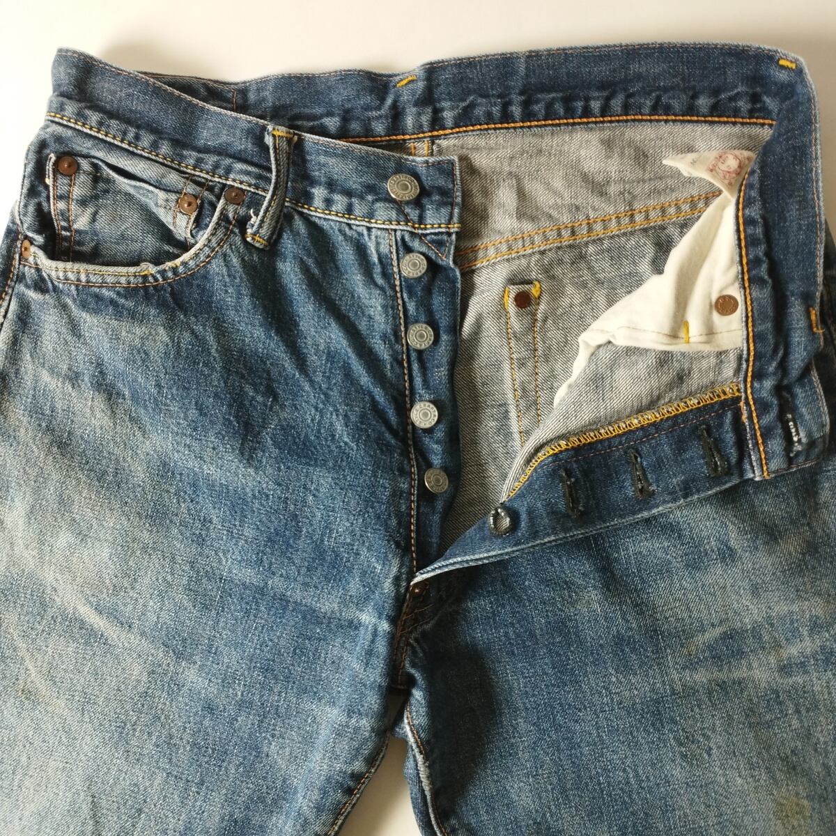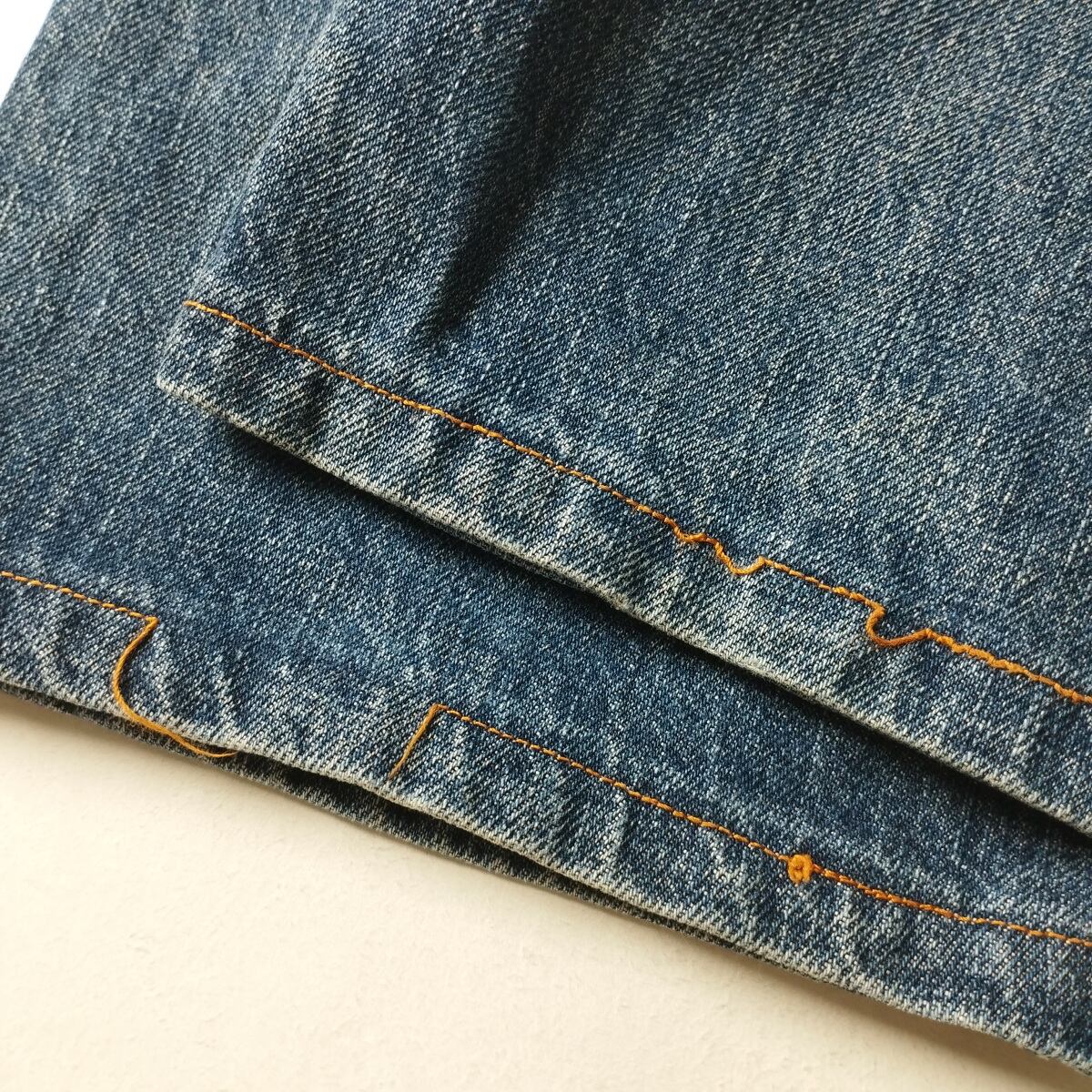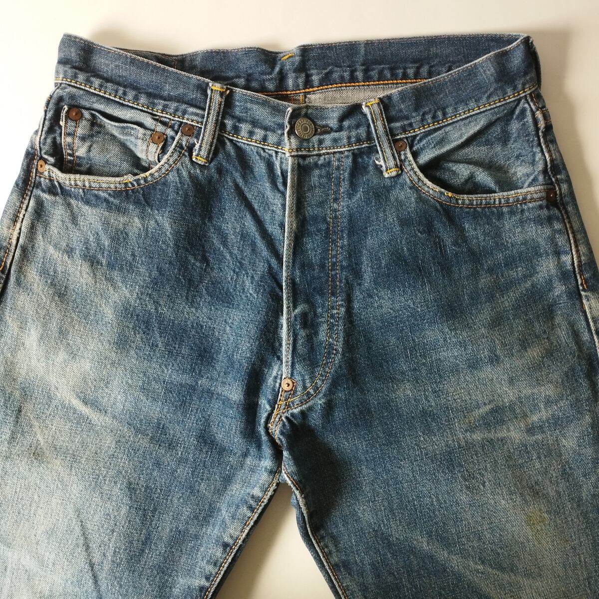 状態は両足太もも辺りに汚れあり、裾のステッチ一部切れていますが着用に差支えのあるダメージは見受けられません。裾シングルステッチ。