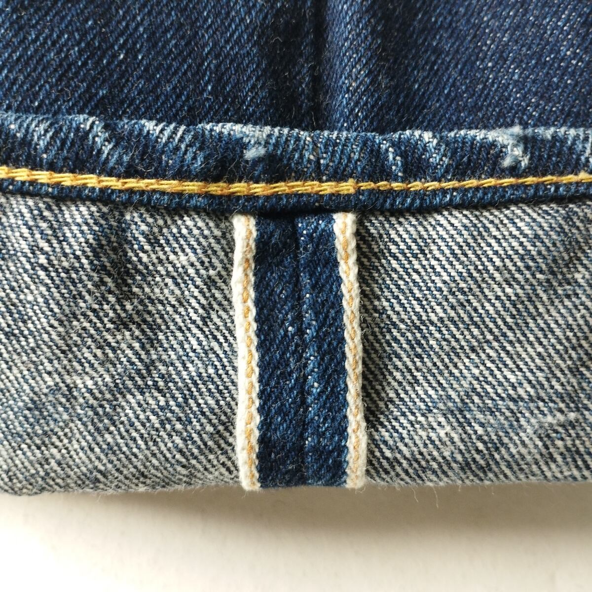 状態は両足裾に色落ちと擦れがございますが大きく目立つダメージは見受けられません。裾チェーンステッチ仕上げ。