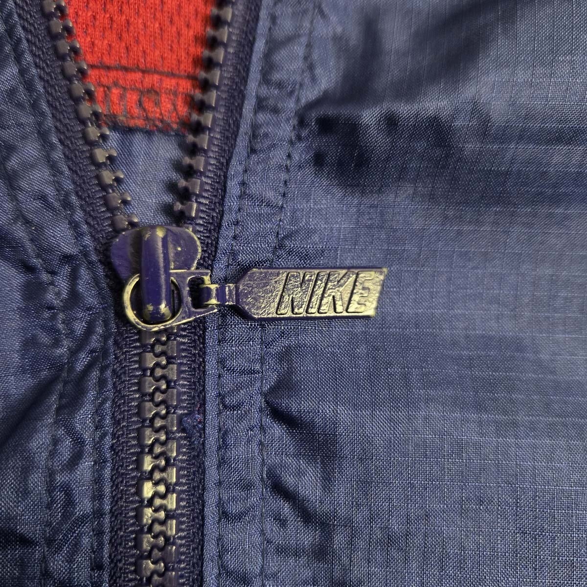90’s ナイキ NIKE 銀タグ ロゴ刺繍トリコ配色切替フルジップナイロンジャケット リップストップ メッシュ裏地 L ブルー m0926-7