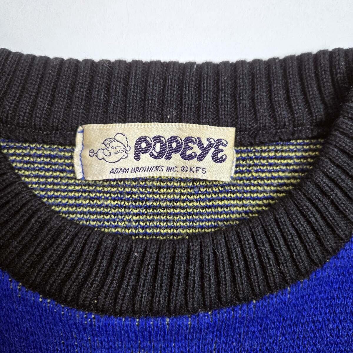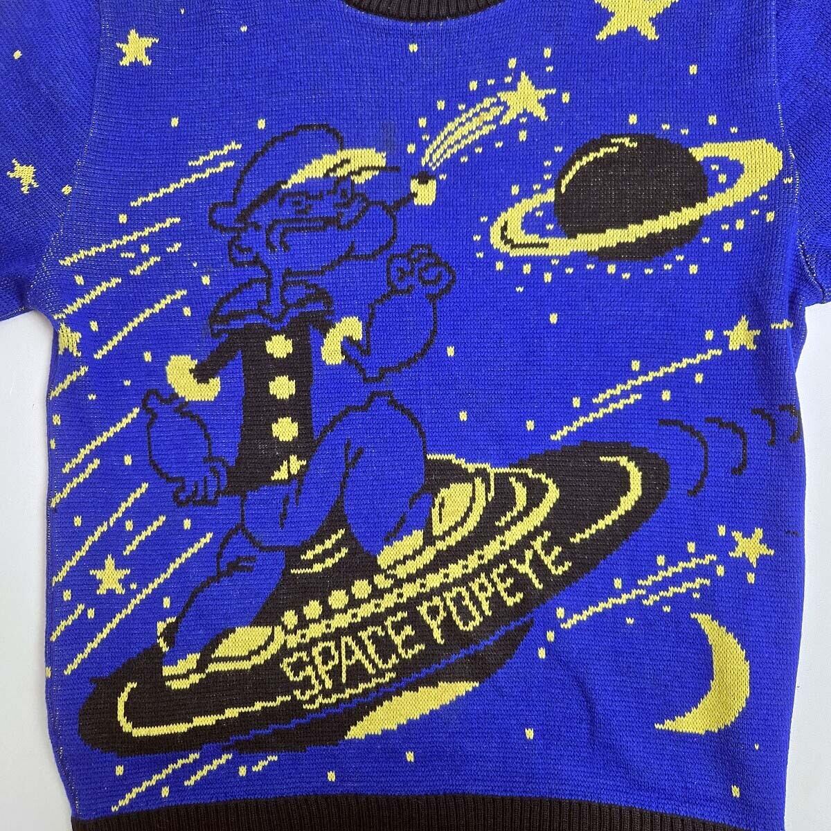 キャラクターニット ポパイ SPACE POPEYE 総柄 クルーネック セーター ブルー 昭和レトロ 国産ヴィンテージ 小さめ ユニセックス着用可